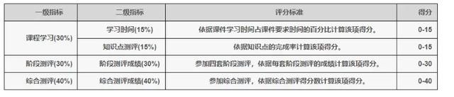 过程性评价内容由网上课程学习、阶段测评、综合测评、学习表现四部分组成,各部分所占分值的比例有:课程学习占25%,阶段测评占30%,综合测评占30%,学习表现占15%这几部分组成。